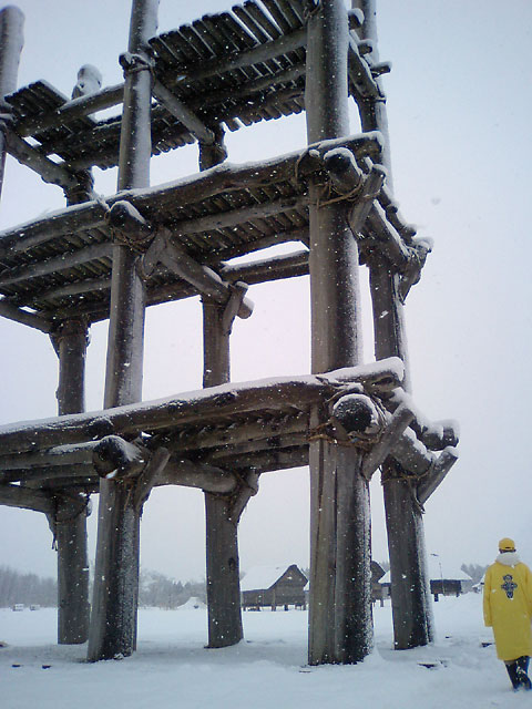 昨晩から雪がかなり降っていまして、朝にはすっかり雪景色になった津軽地方ですが、仕事自体が今日の夕方にならないと着手できないというなんとも歯がゆい状況なのでいろいろ調べていたら、バスで20分ほど行ったところに三内丸山遺跡という別の史跡を発見。そうなるともうじっとしてられなくて、朝っぱらから行ってみることにしました。まだ新しいと思われる立派な博物館的な建物もあるのですが、肝心の遺跡はアウトドアなので雪中行進で見学開始です。当たり前かもしれませんがお客さん誰もいません。ヒマな変人ひとりのためにボランティアのおじいさんが一生懸命ガイドしてくれました。どうもありがとうございます。写真は復元した巨大建造物。果たしてこんな形していたのかどうか調べる術はありませんが、それを想像するのが縄文ロマンだとか。一面雪だらけで建物系しか見ることができなかったのですが、吹雪いていなかったのが幸いでした。結構ボリュームたっぷりなんですけど、入場料は無料。体験企画なども充実していて子供連れだとなおいいかもしれません。同遺跡のシンボルになっている怪しげな土偶も雰囲気十分です。現実逃避して悠久の時にどっぷりつかりたい人や、愛読書を聞かれて「三つ目がとおる」などと言ってしまう人はぜひ。