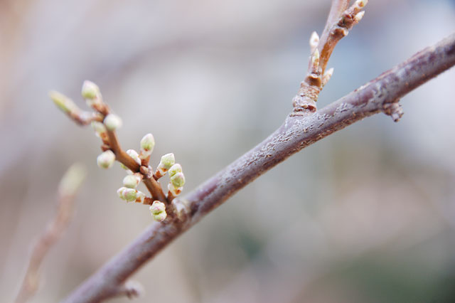 桜はまだかいなと言いたいところですが我が家に桜はなく、かわりにスモモの木があります。じっと沈黙を守っていたようですが、さすがに最近の陽気に心動いたようで蕾をゆっくりとふくらませてきました。桜とはまた違った派手さで、一時的に庭の主役になる日を待っています。