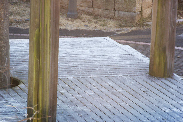 昨晩仕事から帰る際、みぞれ混じりの小雨が車の窓を凍らせていましたが、深夜から朝にかけてちょっと雪を降らせていたようです。さすがに積もりはしませんでしたが、公園のウッドデッキをうっすらと白く染めていました。暖かさに顔をだしてきた草木の芽もびっくりしたかもしれませんね。