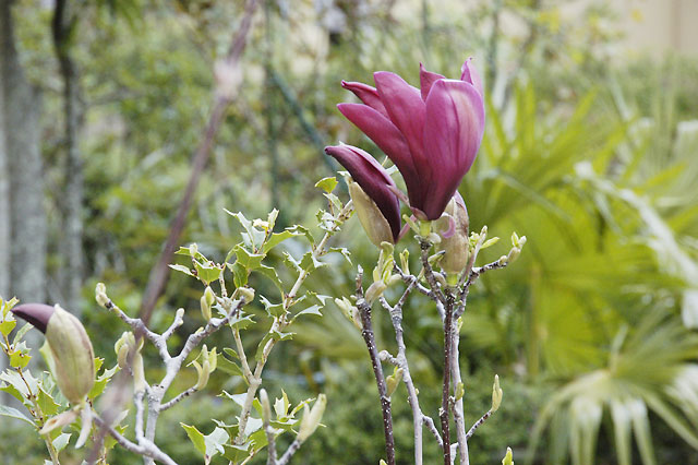 つぼみだけは大きくなっていたシモクレンがようやく開花しました。お向かいのハクモクレンがすごく早く咲いたのでこちらも早くなるかと思いましたが例年通りといったところでしょうか。このシモクレン、背丈が1.5メートルくらいのところで伸びをやめて開花。地際から新たにシュートを出しては同じ高さで開花というルーチンを繰り返すという妙な性格です。そのせいでさっぱり枝が太くならず、本数ばかり立つという状況ですので、今年からは新たなシュートが出ても切っちゃって、本数整理して立派な株立ち樹形にしたいと画策しています。果たして目論見通りいくのやら。