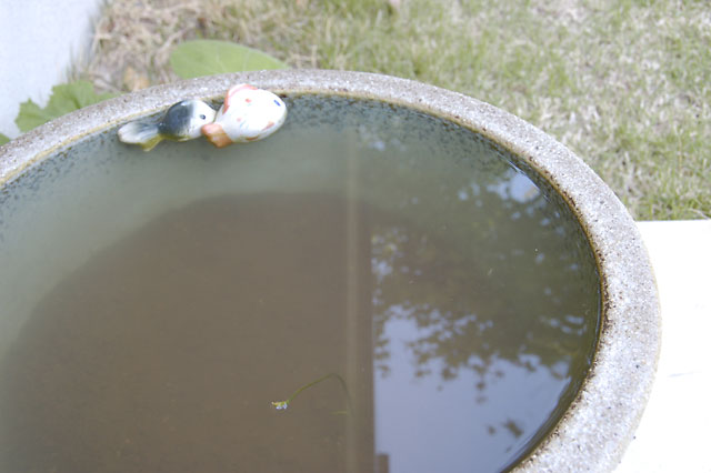 ハスの種発芽大作戦は順調に進行しておりますが、芽がかなり伸びてきた上、2本目の芽が出てきたので睡蓮鉢に移植してみることにしました。まだ根が出ていないのでちょっと心配なのですがいかがなものでしょう。種部分を半分ほど土に埋めてみましたが良かったのかどうか。日曜日に新たな睡蓮鉢を購入して準備を進めていましたが、昨日入れておいた金魚が1匹死亡するという事件が! しかし、種を埋めていて原因がわかりました。お日様の熱でお湯になっちゃってます。日陰になるところに移動したので今度は大丈夫でしょう。しかしヒメダカは同じ環境で全然元気。金魚の方が強いのかと思っていたので意外でした。