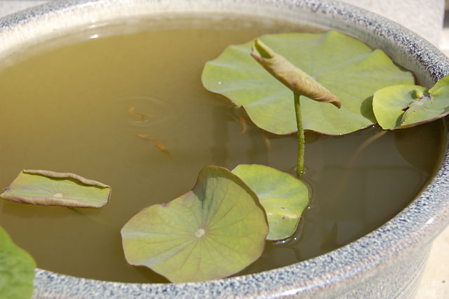 レンコンを入れた方の睡蓮鉢は順調な生育で元気そのものです。水面に浮かぶだけではなく、空中に葉を突き出す姿も見られるようになり、つぼみが上がってくるのが楽しみな今日この頃。メダカもすさまじく元気で、卵持ってるのが確認できました。メダカは水中に発生するコケとか藻とか食べてくれるみたいですね。日光に当たっているにしては水があまり濁らないので助かります。ボウフラも防除してくれますし。一方、金魚の方はと言うとこれがなんとも・・・