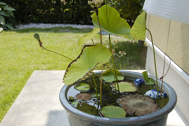 ハスが調子悪いのですが、全景はこんな感じになっちゃってます。ほとんどの葉は枯れかけてますが、新しい葉っぱがいくつか上がってきているのでまだ全滅というわけではないようです。最近知ったのですが、鉢底に腐敗防止用にゼオライト敷くと良かったとか。来年はやろうっと。今からでも小粒のゼオライト入れてみようかと考えています。それと肥料には煮干しがいいとか。自然界では魚の死骸なんかが分解されて肥料になるそうなので理にかなっているとか。うかつに油かすとか入れると、品質によっては水を腐らせてしまうそうです。煮干しもどっこいの気がしますが、来年に向けていろいろと考えています。ちなみに実生のハスの方はすこぶる元気。メダカも元気で、実生ハスの睡蓮鉢にはメダカの稚魚が元気に泳いでいます。