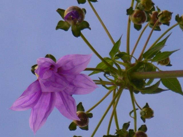 ozillaさんから何度も問合せがありました我が家(花遊庭)の皇帝ダリア三本の蕾が急に大きくなり、今朝、初開花。もう一輪は花びらがほぐれてきたところです。身長は5メートルにもなって2階の屋根の高さほどあり、茎の直径は12センチ、孟宗竹の竿そっくりの姿で、ピサの斜塔みたいに傾いたまま無事成長してくれました。いつ咲くことかか、どんなに心配したことか。やきもきさせられますが、それだけに貴重です。来週中までがちょうど見頃ではないかと思います。トップの花茎の4節下までぎっしりと花芽が付いてます。ご都合がつく方はぜひ見にいらしてください。
