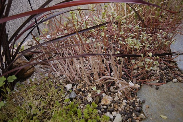 日当たりが悪く、乾燥気味という過酷な環境条件下にある家の西側通路を何とかしようと、昨年秋ごろからセダムを利用した緑化計画を実施しておりましたが、春以降急激に徒長しはじめてついにほとんどの品種が葉を落としてしまいました。日当たりの悪さがやはりダメだったようですね。→セダム定植当時の様子このエリアに適合する植物を探そうと、さまざまな種類が導入されているのですが、現在のところイブキジャコウソウが猛烈な勢いで地面を覆い始めています。乾燥気味なので植えてみたローズマリーも結構いい感じ。いっそのことハーブの小径にでもしてしまいましょうか。