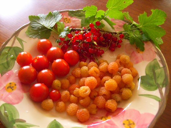 本会会長を務めている花遊庭の加原さんからお便りが届きました。真夏の日差しを思わせる今日、北側の小さなキッチンガーデンで実った一皿です。黄色い実は黄ラズベリー。オープンガーデン時に苗コーナーで販売したものと同じです。植えて4年を過ぎ、キッチンガーデンの枠いっぱいに株が太り、毎日このくらいずつ収穫しています。赤実のものより酸味が穏やかで甘くて香りがいいですよ。苗を購入してくださった方、今年は実がなりませんけど、来年に期待して育ててくださいね。トマトは、ガラスの温室内で最初からプランター栽培のもの。肥料は特製マイブレンドだけ。雨がかからないせいか、病気もなくサクランボより甘くておいしいです。葉のついた赤い実の枝はレッドカラント。その他、ルバーブも2番採りのものでジャムを作って楽しんでいます。