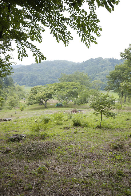と、ここまでは普通のお庭紹介なのですが、圧巻は家の裏側に通じる道を上った先。まるで高原の牧場を思わせるような世界が広がっているではありませんか。敷地面積は4,800坪とか。お引っ越しして来られた当時、ほとんど手つかずで放置されていた広大な敷地を整備し、里山としての姿を甦らせたご苦労の賜物です。山に向かう斜面の草原にはスモモ、柿、栗、梅などの果樹が植えられており、季節ごとに収穫の喜びも。家のすぐ後ろには巨大な山桜が自生しており、春にはピクニック気分でお花見も楽しめるそうです。裏山の中もご主人が熱心に整備をした結果、遊歩道が作られているのにも驚かされました。「この環境は私たちだけではもったいない。門戸を開き、ぜひ多くの人に喜んでもらいたい」という庭主さんの思いが伝わるお庭でした。