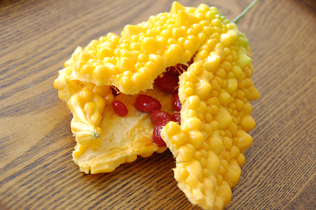 夕立も来ない猛暑の日々が続いておりましたが、ようやく秋の気配。なんだかほっとします。今年はなんとなく2株のゴーヤを植えてみたのですが、結局収穫できたのは7個。雌花の付きが悪かったのは摘芯が遅かったようで、来年また頑張ります。しかしゴーヤは病虫害が無くてホント助かります。手がかからないので仕事にかまけていて収穫忘れていましたら、いつの間にか黄色く熟していまして、パプリカみたいでキレイだなと思って部屋に置いていたら完熟してはじけてました。もう散々です。でも赤く熟した種は甘いんですね。黄色い皮部分もあとで食べてみようと思ったら捨てられてたりして残念です。
