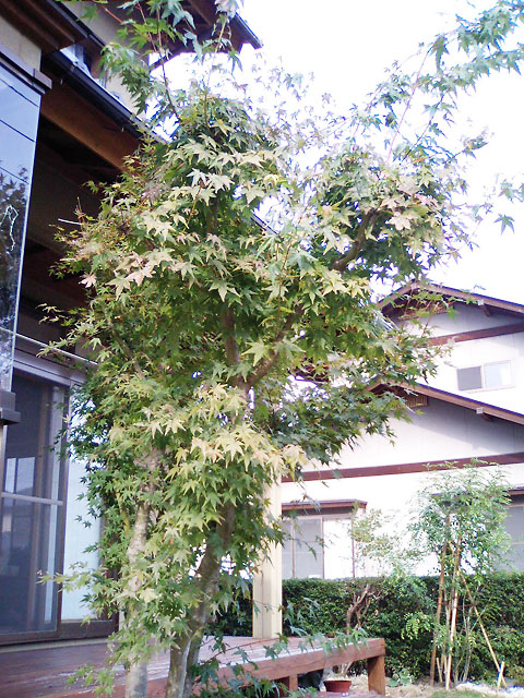 庭の目立つところに一本のヤマモミジが植えてあります。おそらく出窓の目隠しとして新築当時に植えられたものでしょう。ずいぶん大きくなっており、地際から3本に分枝し、モミジらしい曲線を描きながら伸びる幹はなかなか良いものがあります。ただ、その先の枝振りがなんともひどい。こまめに剪定していればまだ違ったのかもしれませんが、大枝を雑に切ったかのようなひどい樹形で、モミジ特有の柔らかさがすっかり失われています。おまけに芽吹きがものすごく、幹からもたくさんの葉がわさわさと生い茂り、生け垣にでもした方がいいんじゃないかと思わんばかり。