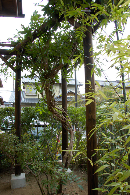 3年くらい前に勢いで庭の隅に植えてしまった藤の苗木でしたが、なにげに順調に成長しており、ずいぶん大きくなってきたので支柱を一本立ててスタンダード仕立てにしていたのですが、先日の台風15号で支柱が見事に折れ、車の上に覆い被さる悲惨な状況になっていました。しばらく放置しておいたのですが、被災状況がなんだか目立ちすぎてしまうので小さな藤棚を作ってもらいました。施工は毎度おなじみの庭園管理植吉さん。狭い場所なので三本柱の変形棚にしていただきましたが、見事に収まっていい感じです。その後も仕事にかまけて放置していましたら、かみさんが棚の下に自生していたミツバを刈ってしまっており、きれいさっぱりな状態に。葉田野さんからいただいた銅葉の品種があったのに! と思ったら、一株だけ難を逃れていましたのでホッとしてます。いい機会だからこの周辺もきちんと整備しておかなければと反省した次第です。