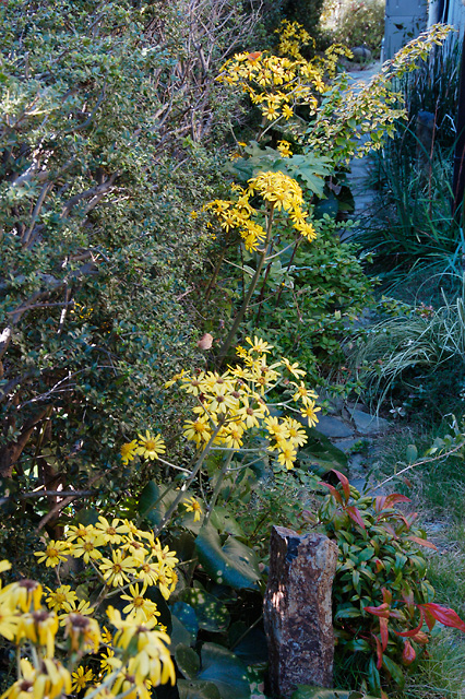庭のツワブキが一斉に咲き出しました。無地、星、白覆輪と、それぞれ違う品種があっただけなのですが、こぼれ種からずいぶんと増えて庭中で黄色い花を咲かせています。放置しておいたらツワブキの庭になりそうな予感すらする状況です。あっという間に10月も終わりで、日を追う毎に寒くなってきました。庭の池や流れにも落ち葉がたまってしまうので、しょっちゅう掃除しています。いつの間にか大量にいるのが発覚したカワニナやタニシの幼生が落ち葉にくっついているので、洗って池に戻してやるという手間が必要で、かなりめんどくさい作業になっています。ツワブキの花が終わる頃になるといよいよ冬の気配。今更ながら1年が早いなと思うこの頃です。