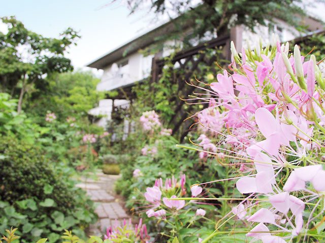 いつも花いっぱいですが、咲く花が毎年変わって違う表情を見せる庭を持つ同店ですが、今年の夏はクレオメが数多く咲き、庭はほんのり薄紅色に。
