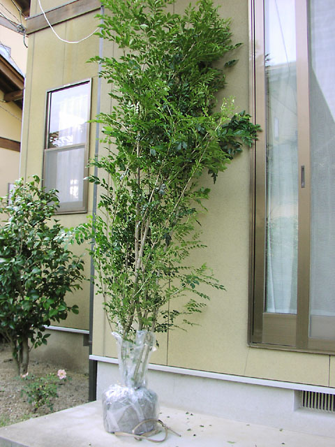 夕方、突然シマトネリコが我が家にやってきました。三重県からの発送とのことでしたので、てっきり明日到着くらいだろうと思っていたのですが、想像以上に早くてびっくりです。ネットオークションで落札した商品ですが、とても良く管理されていて大変良い状態でした。心配していた輸送中の痛みもありません。送っていただいた方に感謝しつつ、枯らすわけにはいかないと、慌てて穴を掘り出しました。