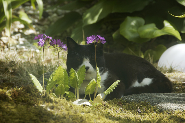 新緑がみるみるうちに庭を覆い、花々が次から次に咲くこの季節ですが、リビング前のエゴノキ下に植えたサクラソウが今年も元気に花を咲かせました。去年より株が増えてますね。日参する隣家の猫がしばしばくつろいでいるのがこのポイント。人の気配にふと顔を上げた姿は、花のリボンを付けているようでした。