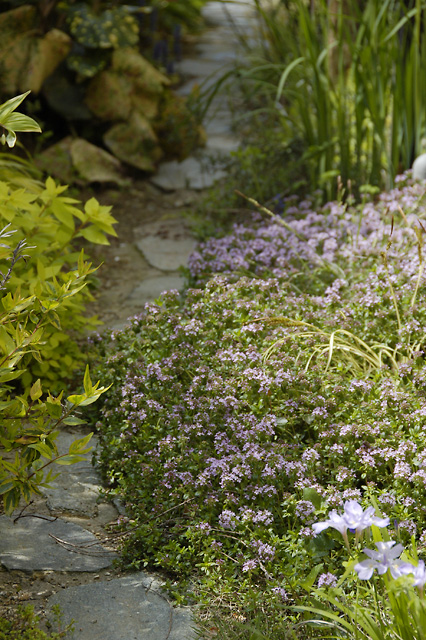 ホント花いっぱいの季節になりました。我が家の庭は一年で一番いい季節かもしれません。家の西側通路に植えたクリーピングタイムが増えること増えること。実は和製のイブキジャコウソウが隣に植えてあるのですが、すっかり負けてます。花が可愛いので家族にも大好評。このエリアには何が育つのかいろいろ植えてみたのですが、期待していたアジュガやセダムはあまり増えず、結局タイムとヒメウツギが勢力を伸ばしています。日陰部分ではツワブキやホスタが期待できそうです。ラベンダーを何種類か植えてみたのですが、日当たりが悪いためか、1年で全滅でした。適性を見極めるためにいったいどれだけの植物をダメにしてしまったか。お恥ずかしい限りです。