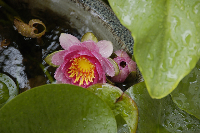 台風の影響でしょうか、朝から強い風と雨の一日でしたが、故に本日は完全休暇日と決め、のんびりと過ごしていました。たっぷり時間かけてカレー作ったり。こんな日はいつ以来のことだったでしょうか。ふと庭先の睡蓮鉢に目をやると、いつしか茂った睡蓮とカラーの葉に埋もれるように濃桃色の睡蓮の花が咲いていました。そんな季節なんですね。雨に打たれて水滴をいっぱい浴びていますが、まさに水を得たように雫が似合う花でもあります。