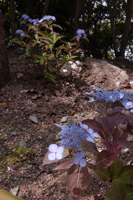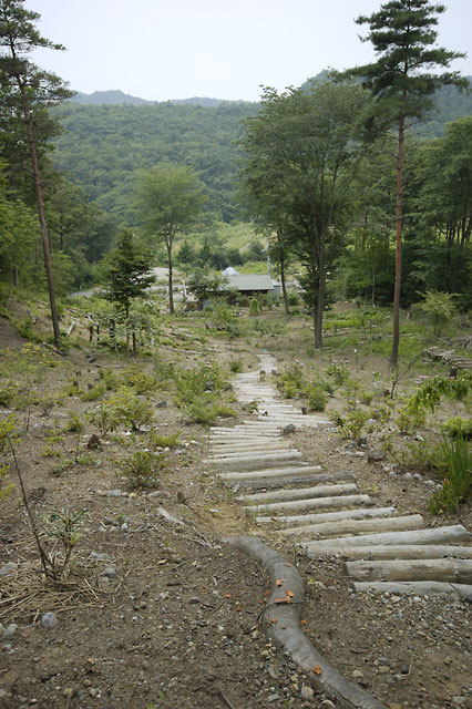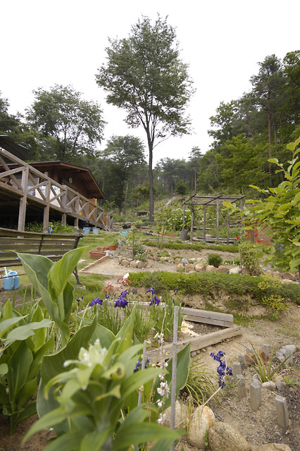 と、ここまでは普通のお庭紹介なのですが、圧巻は家の裏側に通じる道を上った先。まるで高原の牧場を思わせるような世界が広がっているではありませんか。敷地面積は4,800坪とか。お引っ越しして来られた当時、ほとんど手つかずで放置されていた広大な敷地を整備し、里山としての姿を甦らせたご苦労の賜物です。山に向かう斜面の草原にはスモモ、柿、栗、梅などの果樹が植えられており、季節ごとに収穫の喜びも。家のすぐ後ろには巨大な山桜が自生しており、春にはピクニック気分でお花見も楽しめるそうです。裏山の中もご主人が熱心に整備をした結果、遊歩道が作られているのにも驚かされました。「この環境は私たちだけではもったいない。門戸を開き、ぜひ多くの人に喜んでもらいたい」という庭主さんの思いが伝わるお庭でした。