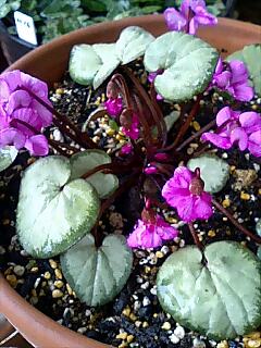 左のシクラメンは原種系のシクラメン「コウム サクヤザワ」。派手な園芸種と違い、全てがミニサイズでとても繊細ですが、たくさんの花を付けてくれました。花も可愛いですが、斑入りの丸い葉っぱも実にステキ。山形県に「作谷沢」という地名がありますが、同県ではシクラメンの生産が盛んですので、もしかしたら作出された地名なのかもしれませんね。