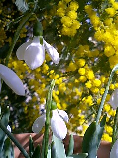 最後はミモザ。1月頃に咲き始めたミモザも今が盛りとなり、黄色い花をたわわにつける姿は、常磐線の車窓からも一際目立つ存在で、庭をいっそう華やかにしています。春の球根植物も次々と開花を始める季節。辺りを鮮やかな黄色に染める“先輩”に向け、スノードロップの白い花が挨拶しているようです。