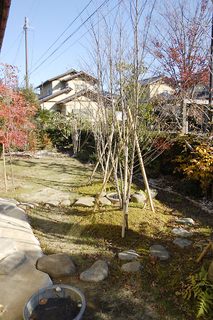 庭のハナミズキが見事に紅葉していたのも先週まで。今はモミジがようやく色づいてきました。先週、いつもお世話になっている植木屋さんのお手をお借りして、手つかずだった庭木の剪定をようやくすることができました。以前自分が木によじ登って剪定していた際、足を踏み外して危ないことがありましたので、今回スモモとグミは手が届く高さまで切り詰めていただいたので、今後はちょこちょこ手入れできることでしょう。多分。そのグミの下に鬱蒼と茂っていたツツジの株があったのですが、いかにも生け垣で余った株を植えたっぽい雰囲気であまり意味がなかったうえに、足を踏み入れることが出来ずに手入れしにくく暗い雰囲気だったので撤去してもらいました。撤去後には今後水場を造る予定ですがいつになることやら見通し立たずです。