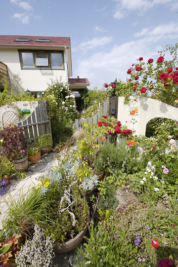 玄関先のホクシアのコレクション、トレリスを覆う色とりどりのバラやクレマチス、なにげなく隠された小さなビオトープ、そして珍しい植物の数々など、見どころ満載のお庭ですが、車窓から見えた“異空間”が気になり、最寄りの駅で降りて訪ねてくる人もいるとか。近所の幼稚園の散歩コースにもなっており、庭仕事をしながら庭主さんが歌う沖縄民謡に子供たちが拍手する光景が見られるなど、庭主さんだけでなく、地域の人々に愛されている幸せな庭です。