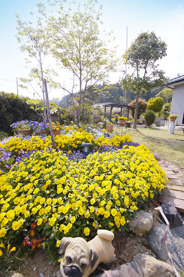 緩いスロープを上り、門を抜けた先に広がるガーデンは、ぐるっと花壇に囲まれており、家の門から玄関への敷石を境に、芝庭エリアとレンガ敷きエリアに二分されています。このエントランスゾーンだけではなく、家の外周や奥にもさまざまなゾーンが展開されており、広い敷地を隅々まで使って多くの草花が栽培されているのも魅力のひとつ。「広いので手入れが大変ですよ」と語る庭主の永瀬さんの一番のお気に入りはパンジー。春になると庭中が可愛らしいパンジーの花で彩られます。
