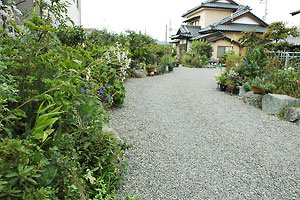 一行を乗せたバスは新興住宅地へ。田口さんのお庭に着いて真っ先に感じたのは外に向けて手を広げているような開放感。庭が「どうぞいらっしゃいと」手招きしているような感覚でして、通りがかりの人は思わず足を止めるのではないでしょうか。まさに“オープンガーデン”と呼ぶにふさわしいと感じました。 住宅街では限られた面積を駐車スペースに取られてしまってお悩みの方も多いでしょうが、このお庭ではガーデンそのものを駐車スペースに転用させるさまざまなアイディアが盛り込まれています。 前の道路から家までの広いスロープには枕木がふんだんに使われ、その隙間にはこぼれ種が芽を吹かせ、四季折々の花を咲かせます。草花が生い茂るところを短く刈り込むと現れる駐車スペースなど、言葉では語り尽くせません。 たくさんの草花に囲まれる中、来場者との話が盛り上がり、写真のように庭主さんが種や苗を振る舞う場面も。これもオープンガーデンの醍醐味のひとつですね。