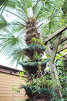 ツアー最後のお庭はちょっと北に離れたところにある鈴木さんのお庭。高速に乗って移動です。こちらの周辺は桜並木で有名なところ。春には満開の桜のトンネルをひと目見ようと、大勢の人が訪れます。桜見物と共にお伺いできるといいですね。あいにく今回庭主さんは海外渡航中とのことでしたが、門から庭の奥に進むに従い、植栽の変化が楽しめるお庭でした。と、敷地内に入って右のシュロを見ると、表皮をめくってコンテナにしているではありませんか。[写真]これは目から鱗モノのギミックです。庭の奥には池があり、そのほとりに置かれた流木の上には、すっかり辺りと同化した熊の木彫り人形が。さまざまな庭の住人が心地よいハーモニーを奏でています。