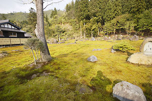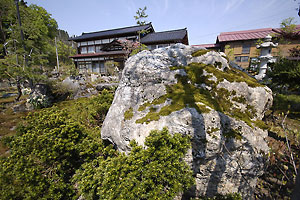 いわきを出発して約5時間。オープンガーデン新潟の代表、小倉さんと合流して最初にお伺いしたのが「甚左衛門」さんの庭。庭の名称は実際に現地で使われている屋号に由来しています。こちらでは名字ではなく、屋号で呼び合うことが多いそうです。入り口から一面の杉苔に覆われた苔庭です。庭内には大小数々の石が配置され、飛び石を伝って庭内を巡ることができます。数ある巨石・銘石がひしめく中、写真は四国から運ばれたというさざれ石。君が代の歌詞通り、苔むした感じが実に素敵です。
