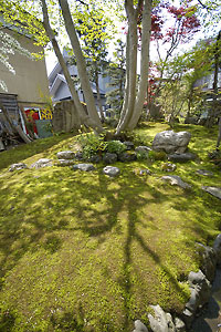 日は西に傾いてきましたが、7軒目にご案内いただいたのは永昌庵さん。お寺さんです。本堂に向かって右側が一面の苔庭、左側が芝庭になっています。広い苔庭の存在感に圧倒されますが、本堂裏の山には滝があり、その景色もなかなか見事です。
