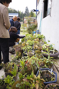 次も山野草コレクションが続きます。ご案内いただいた五兵衛さんの庭では、奥さんが丹念に育てている山野草の鉢々が出迎えてくれました。コレクションの数は200品種を超えるとのこと。見事な石組みによる池もありますが、ちょうど池掃除のため水を抜いてありました。思い返すとどのお庭にも池がありましたが、新潟名産の錦鯉が関係するのでしょうか。石と池の庭文化という印象が強まってきました。