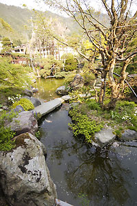 続いてお伺いしたのは関寓房。個人のお庭ですが、そのクオリティはものすごいものがありました。入り口からどどんと巨大な佐渡の赤石が迎え、頭上には見事な祇園桜が花のシャワーを降らしていました。中に進むと、どうやって運んだのか不思議に思う程の巨石から湧き出る滝があり、流れの先には色とりどりの錦鯉が優雅に泳ぐ池。庭を巡ると数々の巨石・銘石が次々と迎え、奥には竹林まで。庭をあちこち歩いていて思いましたが、どのアングルから見ても隙がない。とても完成された素晴らしい庭だと思いました。庭主さんもオープンガーデンの心にあふれ、観るだけでなく、人とのふれあいに幸せを感じるお庭でした。