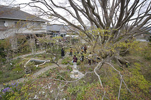 引き続き花遊庭さんへ移動し、昼食の時間を取りました。お庭はシデコブシや土佐ミズキ、日向ミズキなどの花木が淡い彩りを添えてとても春らしい光景でした。昨年末から取りかかっていた池のリニューアルもすっかり終わり、水辺の周りには新しい風景が広がっています。足下に目をやればクリスマスローズやバイモユリが楚々とした花を咲かせ、ビオラや水仙たちと色彩のハーモニーを奏でていました。葉を落とした“庭主”のヤマモミジもすごい存在感です。