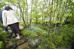 4軒目の鈴木百合子さんのお庭を訪問するころには、朝から降っていた雨が止んでなによりです。満開のフジとコデマリが迎えてくれたお庭には、オープンガーデンの看板が立てられており、いつでも来訪者を受け入れてくれる準備が整えられていました。会員の皆さんは既にご覧になっている方が多いですが、一般参加の方々は女性ひとりで積み上げた石垣に驚かれていたようです。恒例となった山の遊歩道散策も心地よく、ヒノキの森林浴をしながら山野草たちを目で追うのが楽しかったです。