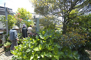3軒目はガーデン紹介のページでも紹介している阿部喜深子さんのお庭。モッコクの木陰に山アジサイが葉を伸ばす和風のエリアから芝庭を通り、バラをはじめとした多くの花が咲くゾーンへの変化が楽しいガーデンです。一番奥には大きな株立ちのヤマボウシがたくさん花を付けていて実に見事。ガーデン内にあるパーゴラ仕立ての東屋には木蔦が涼しげな緑陰を作り、晴れ渡った陽気で上昇し続ける気温の中、心地よい休憩所となっていました。