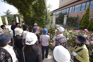 本日のツアーも大詰め、敷地内に広いバラ園を持つ山田町の結婚式場、コリーナさんに向かいました。バラのシーズンということもあり、バラを目当てに多くの人が来場していました。アーチや壁面への仕立てなど、とにかくスケールが大きいのにびっくり。広い敷地なので自由見学ということでしたが、バラ管理をされている佐藤さんが登場してからは自然とバラ講習会へ。土づくりや仕立て方をはじめ、冬場の管理や良い苗の選び方など、ためになる話の連発でした。お人柄が明るく、お話も大変おもしろくて盛り上がる中、本日最後の行程となるのはその佐藤さんのご自宅。いったいどんなお庭なのかわくわくしながら向かいました。
