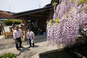 今年はどの花も咲き急いでいるようで、3軒目の鈴木百合子さんの庭の藤も、ツアーまで持つのかどうかわからない状況でしたが、コデマリと並んで満開の花で迎えてくれました。1号車と2号車がほぼ同時刻に到着しましたが、片方のチームがお昼をとる間に別チームはお庭見学を行い、有効に時間を使うことができました。昨年巨大な姿を見せてくれた皇帝ダリアを挿し木して増やし、家の前の畑に植えてある様子に参加者一同興味津々。秋が楽しみですね。恒例となった裏山の杉林散策では心地よい空気を味わい、お昼ごはんも一層美味しく感じられました。